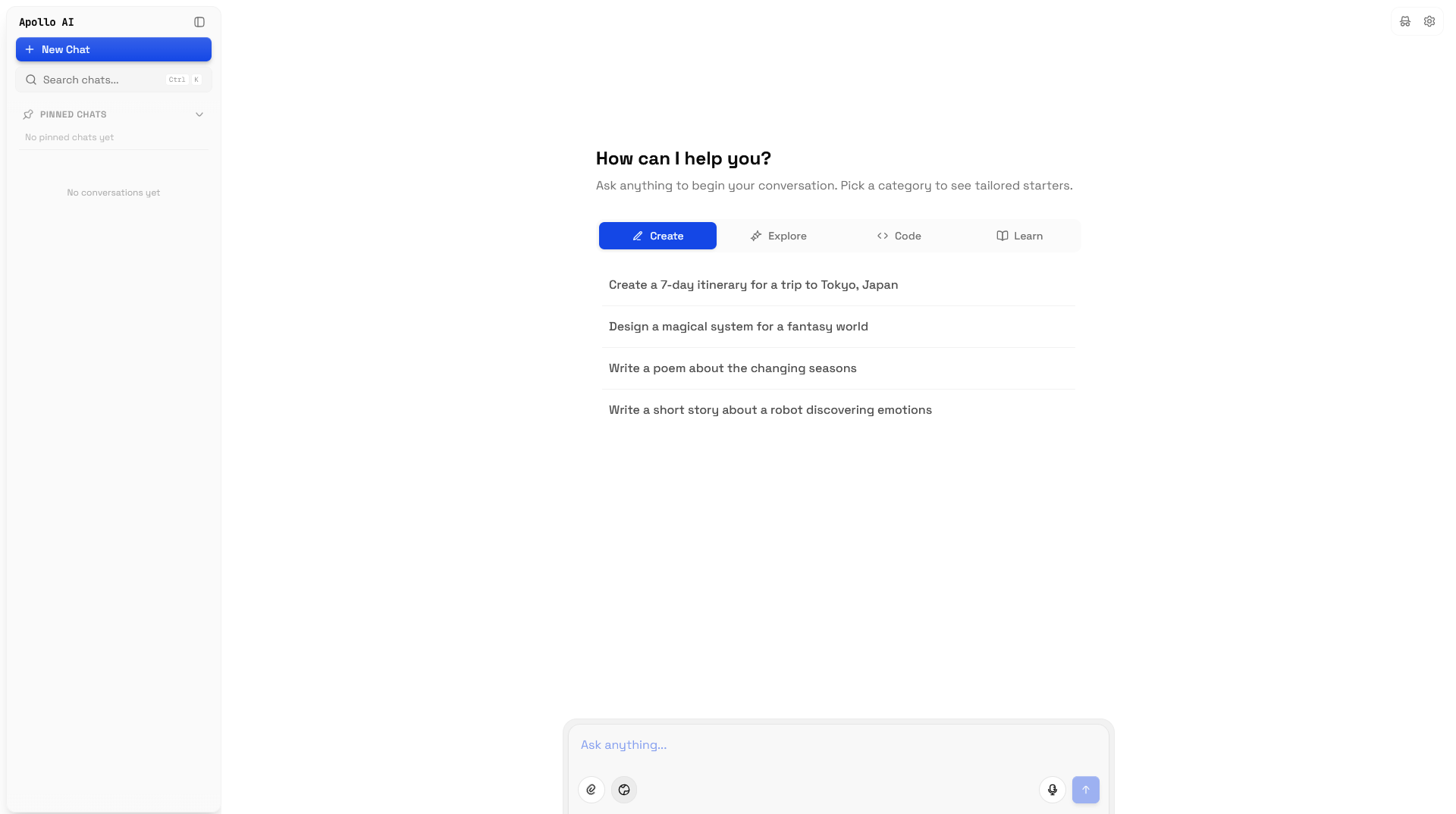 - Empty State — Category tabs (Create, Explore, Code, Learn) with randomized prompt suggestions; clicking a card populates the input field